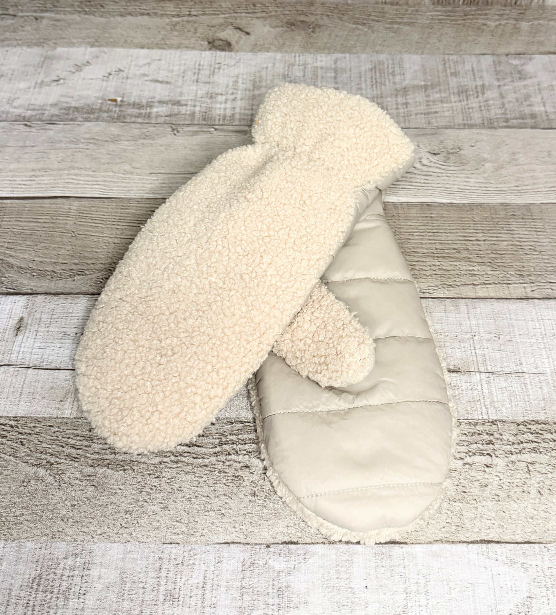 Jolie mitaine avec le dessus en imitation de mouton . Le dessous est en nylon et la mitaine est doublé de sherpa pour être au chaud.